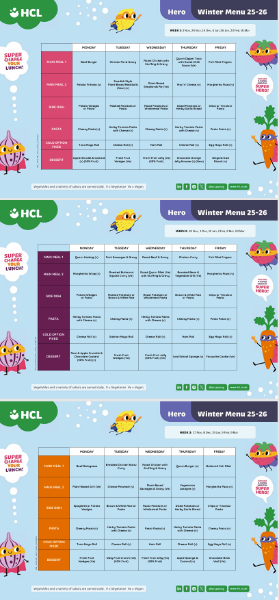 School meals are provided by HCL and are available for all pupils. Provision is also made for children whose parents wish them to eat a packed lunch brought from home. We do ask parents to follow the guidance regarding healthy packed lunches in the guidance below.