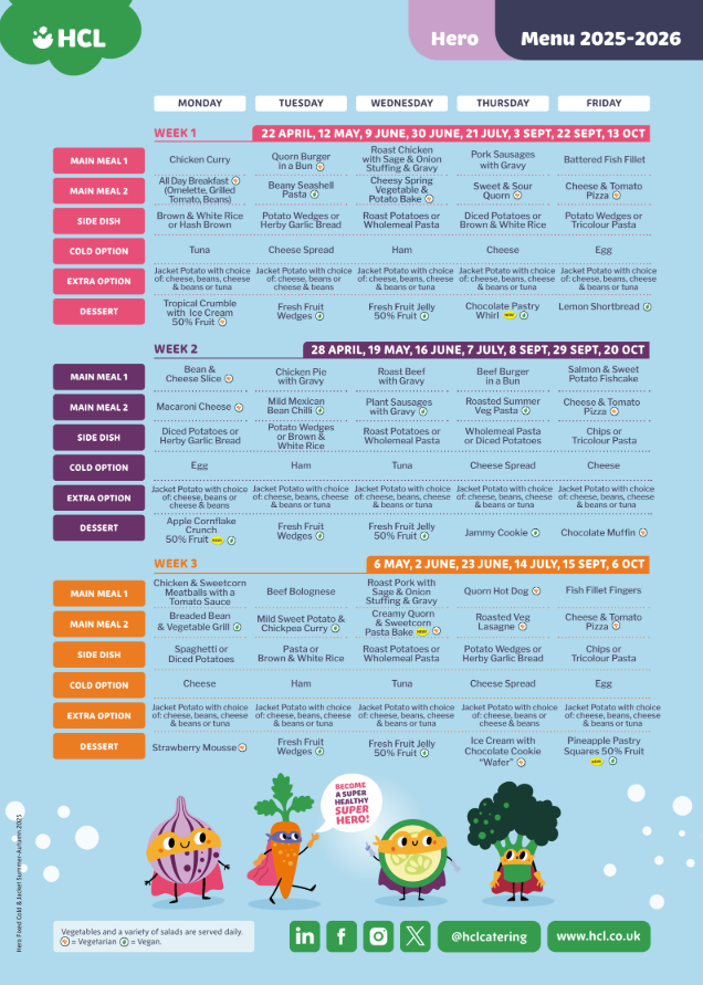 School meals are provided by HCL and are available for all pupils. Provision is also made for children whose parents wish them to eat a packed lunch brought from home. We do ask parents to follow the guidance regarding healthy packed lunches in the guidance below.